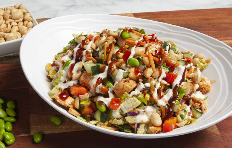 Romaine, Napa Cabbage, Red Cabbage, Roasted Rotisserie Chicken, Corn, Edamame, Red Peppers, Carrots & Peanuts and is topped with our Spicy Thai dressing with Korean BBQ and Wasabi drizzles