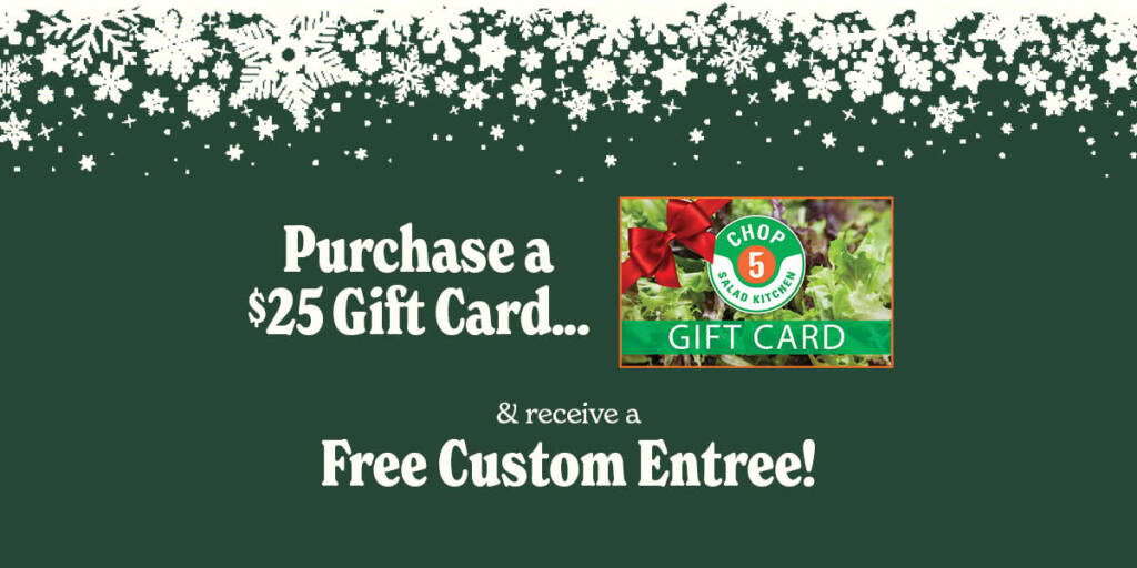 Eat with no regrets.CHOP5 Salads & Bowls is committed to creating healthy, flavorful dishes using only the freshest available produce and premium ingredients. Each item on our menu is packed with nutrition to power you through your day so you can dream big, achieve more, and feel great about your choices. By allowing you to customize what goes into your dish, we happily support your dietary preferences and needs.